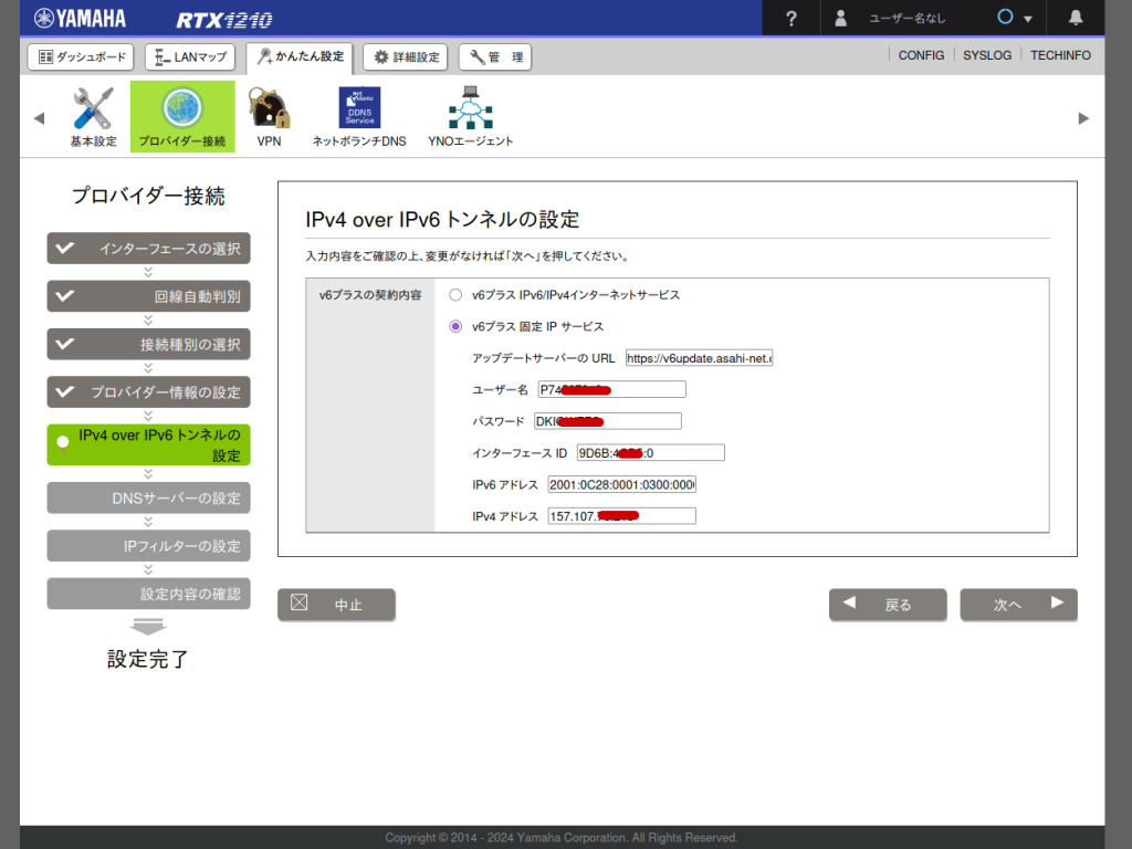 固定IP が開通すると Asahiネット のマイページで以下のような情報を見ることができる。これらを適宜 RTX に投入する必要がある。