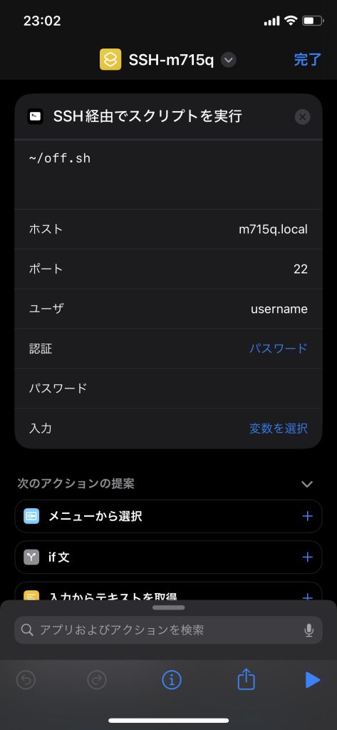 上記を解決する為に、iphoneのショートカットアプリでssh ログインしてシェルスクリプトを実行することにしました。