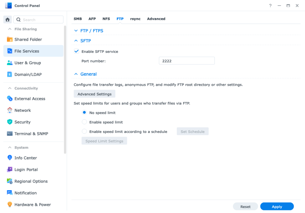 個人的に忘れがちなので、というのも他の Linux と異なり Synology の NAS のコントロールパネルでは、SSH をオープンにしても SFTP は使えないので別途、有効にする必要がある。