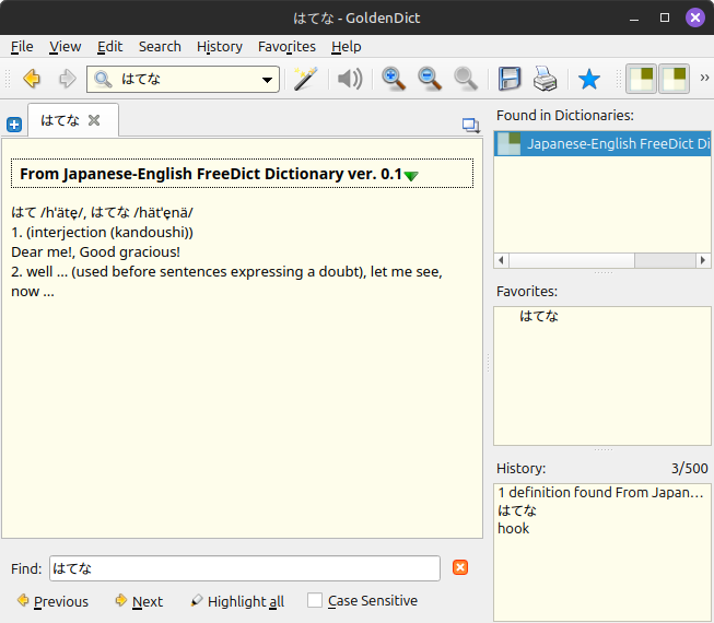 GUI ツールは色々あるが goldendict がいいかもしれない。goldendict-ng というのもあって見た目はいい感じだが例題の 「はてな」が見つからない事例があった。一方の goldendict ではきちんと検索できたので一旦はこちらを使用することにしよう。