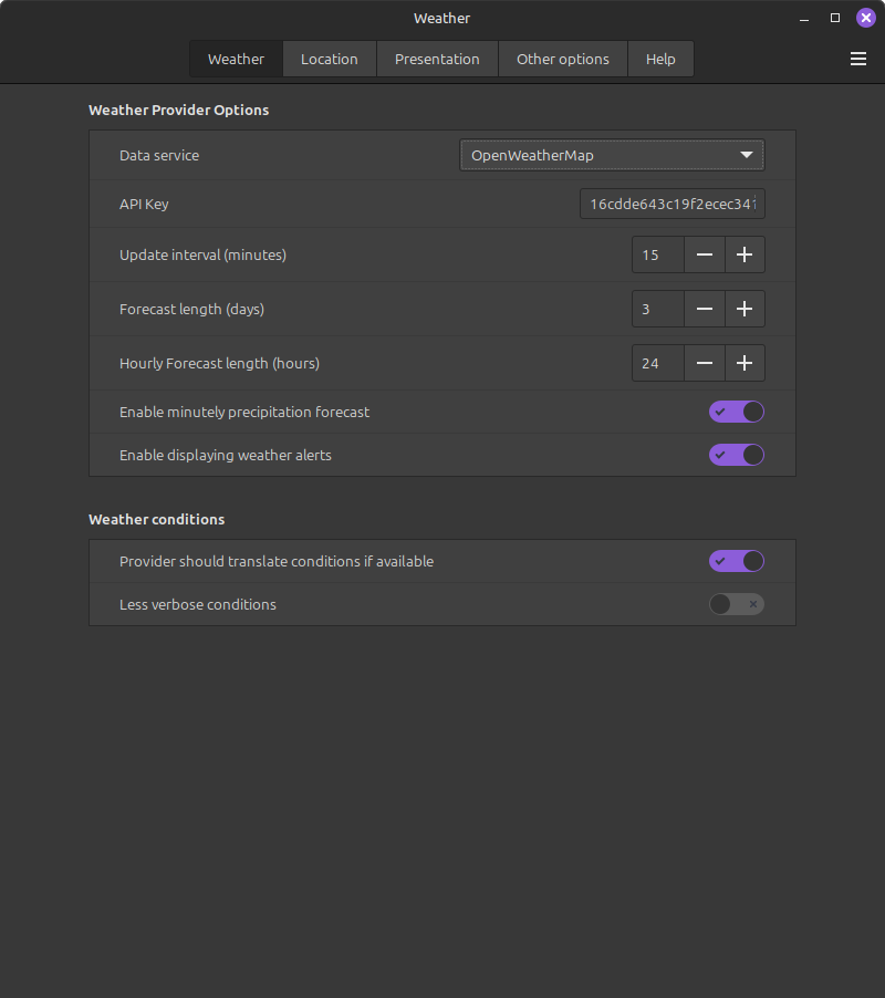 Data service は OpenWeatherMap か Open-Metro を選びます。他は多分動きません。API Key は無ければ空でも OK です。