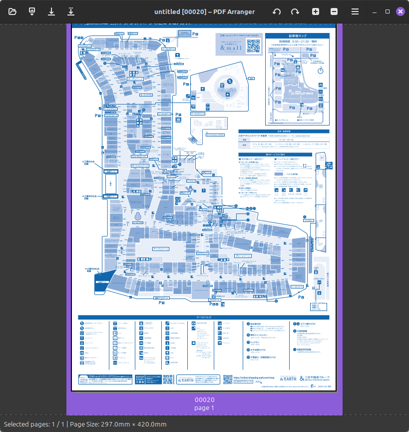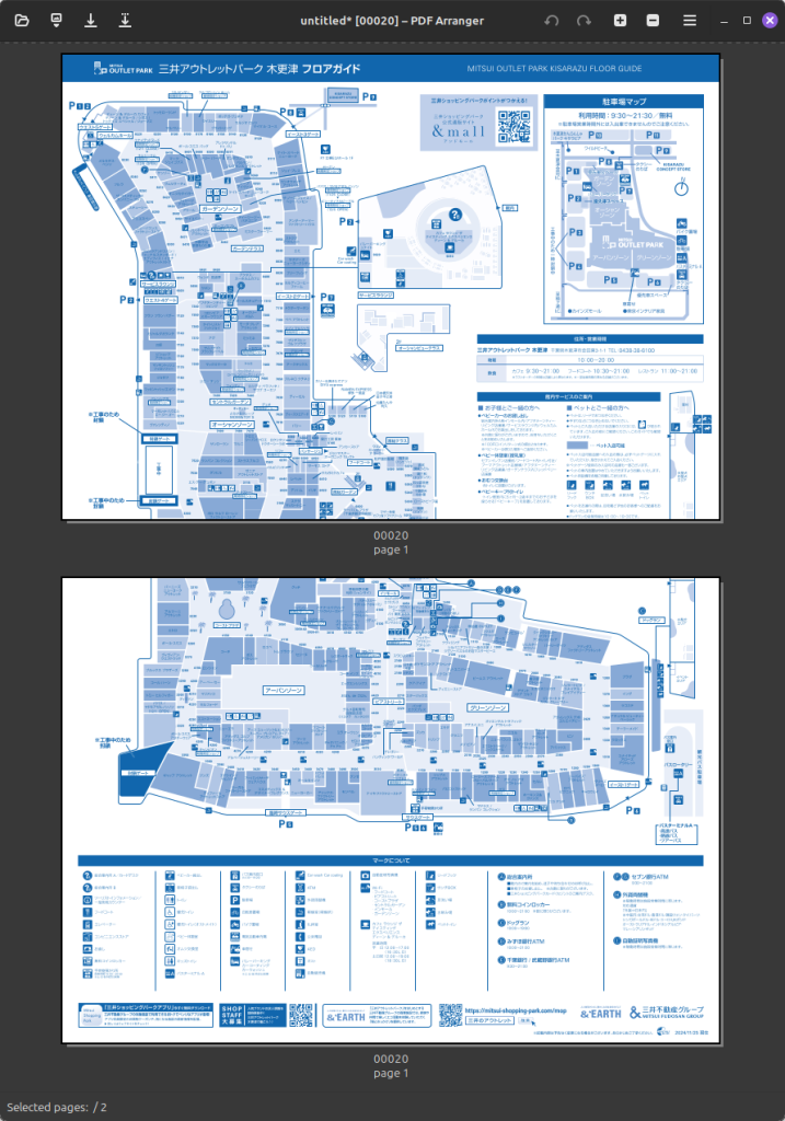 $ sudo apt install pdfarranger試しにとあるモール(まあ木更津ですね。ここの地図はA4で印刷するとショップ名が小さすぎて読めません)の地図を開いてみます。